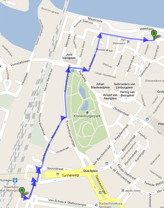 Vanaf station Nijmegen is het 12 minuten lopen. Zie de kaart voor de wandelroute: