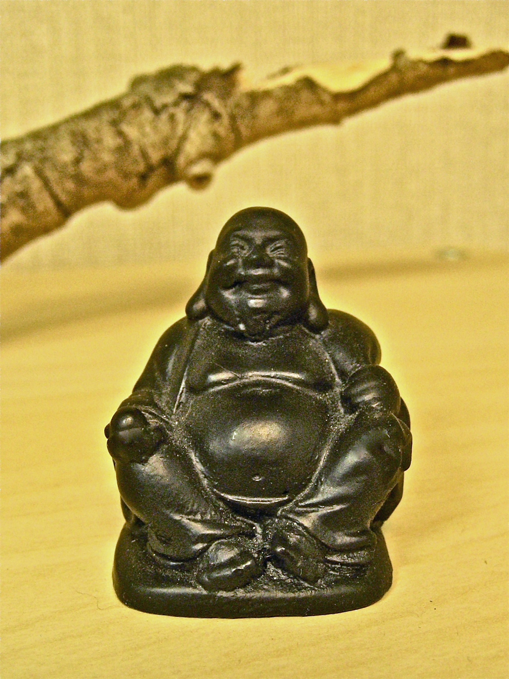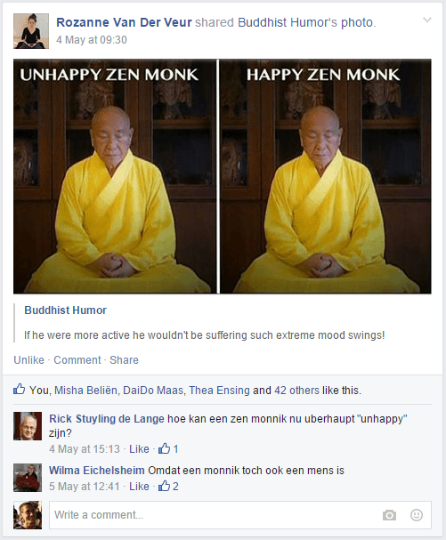 Gekregen, want dat schijnt zo te horen. Ik verwaarloos ze. In de tuin zit er een, gekregen van mijn ouders. Er staan een paar uitgebluste hyacinten bij. Laatst hadden mijn kinderen een paar madeliefjes en paardenbloemen in zijn schoot gelegd. Aandoenlijk toen. Nu uitgedroogd en dor. Als ik dan tegen mezelf zeg dat dit symbool staat voor ‘leven en dood zijn één’, dan weet ik dat deze gedachtegang een excuus is voor passieve verwaarlozing. In de boekenkast staan nog een paar exemplaren te verstoffen, hoewel ze me dierbaar zijn, want gegeven uit een goed hart. Bij Zen.nl Vught staan ook Boeddhaatjes. Een lachende in de ontvangstruimte en een hele kleine in de zendo. Het is goed mogelijk dat niet iedere cursist die kleine al heeft gezien. Het voelt goed, deze kleine Boeddha’s. Die lachende is mijn ideaal, hoewel ik zijn corpulentie niet ambieer. En die kleine in de zendo is mooi bescheiden, laat iedereen in de ruimte zélf Boeddha zijn. ‘De Boeddha bestuderen is jezelf bestuderen’, schreef zenmeester Dogen ongeveer. Ik leer veel van de Boeddha. Ik blijf beelden bestormen, zal de bloemen eens verversen in de tuin en de stofdoek hanteren bij de boekenkast. Misschien een keer een grotere aanschaffen voor de zendo. En mag ik bij deze een oproep doen om alle Boeddhabeelden zo te draaien dat ze niet met de rug naar mensen toe zitten?