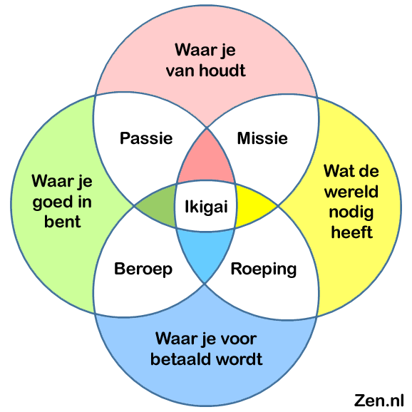 Dus het lijkt de moeite waard om je meer bewust te worden van je ikigai en eens te onderzoeken hoe die bij jou in elkaar steekt. Kleur je eigen ikigai schema in en kijk hoe je er nu voor staat en kleur het misschien nog eens in voor hoe je wilt dat het er over een jaar voor staat. Ideaal gesproken heeft je ikigai een mooie mix van alle ingrediënten uit het model. Misschien dat er uit je toegenomen ikigai-bewustzijn zelfs nieuwe goede voornemens voortkomen, die overeenkomen met waar je van houdt, wat de wereld nodig heeft, waar je voor betaald wordt en waar je goed in bent. Naarmate je je hier meer op richt in de keuzes die je maakt, betekent dat misschien wel niet alleen maar een meer doelgericht 2016, maar zelfs een langer leven. Ik wens je veel ikigai toe en mocht je het nog niet helemaal voelen, kom dan naar een van