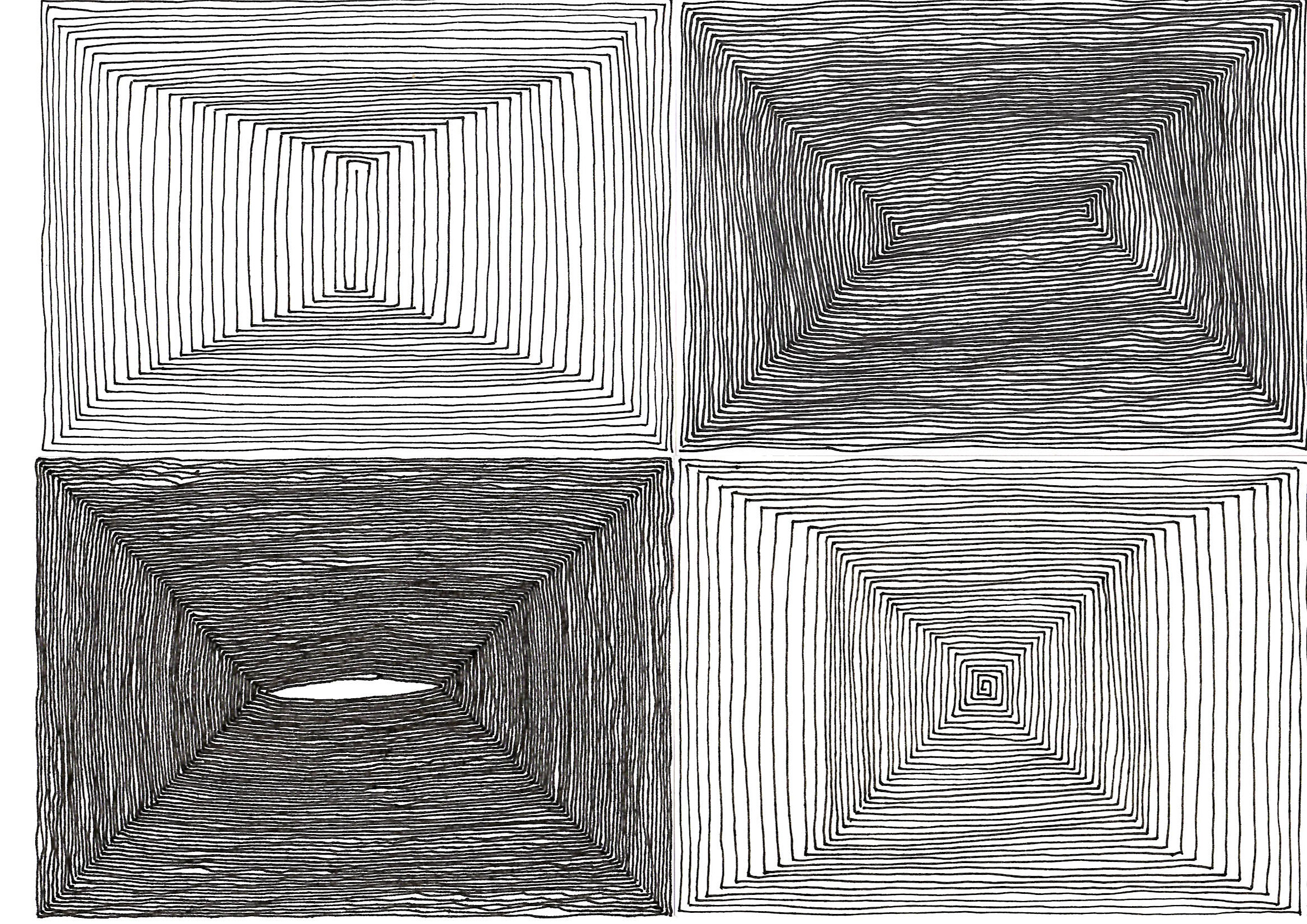 Gewoonlijk als je mensen vraagt een eenvoudige rechte lijn te trekken, en niet meer dan dat, dan slaat de twijfel toe. ‘Wat bedoel je?’, ‘Bedoel je echt alleen een rechte lijn?’, ‘Mag het ook iets anders zijn?’, ‘Mag ik ook een liniaal gebruiken?’. Het bijzondere van een met de hand getrokken rechte lijn is dat ze enerzijds super simpel is en bijvoorbeeld veel gemakkelijker is dan het trekken van een cirkel, maar anderzijds direct voelbaar wordt dat je in deze ene lijn alles laat zien. Ons talent of het gebrek eraan wordt er in bloot gelegd en of je je aandacht erbij hebt of niet wordt direct zonder kans tot mooier maken helder. De rechte lijn is een spiegel en deze laat alles zien. Het is een zuivere reflectie van alles wat ik hier en nu ben en doe. De oefening die ik voorstelde tijdens de gehele sesshin te herhalen deed juist dit. Het vraagt niets anders dan op de adem dicht tegen de rand van het papier een rechte lijn te trekken, dan het vel te draaien om een tweede lijn te maken en iedere volgende lijn op een zelfde wijze aan elkaar te rijgen, tot zich een hoekige spiraal vormt die in het midden eindigt. De lijnen staan dicht bij elkaar en hoe meer lijnen je zet hoe meer ze met de tussenliggende ruimte en elkaar in gesprek gaan. En een ding is zeker: hoe dit gesprek loopt, wat het je zegt, wat deze spiegel jou te vertellen heeft, kan alleen gaandeweg worden ontdekt. Je moet erin gaan en kunt niet aan de zijlijn blijven staan en je achter woorden en inbeeldingen blijven schuilhouden. Kortom de deuren moeten open!