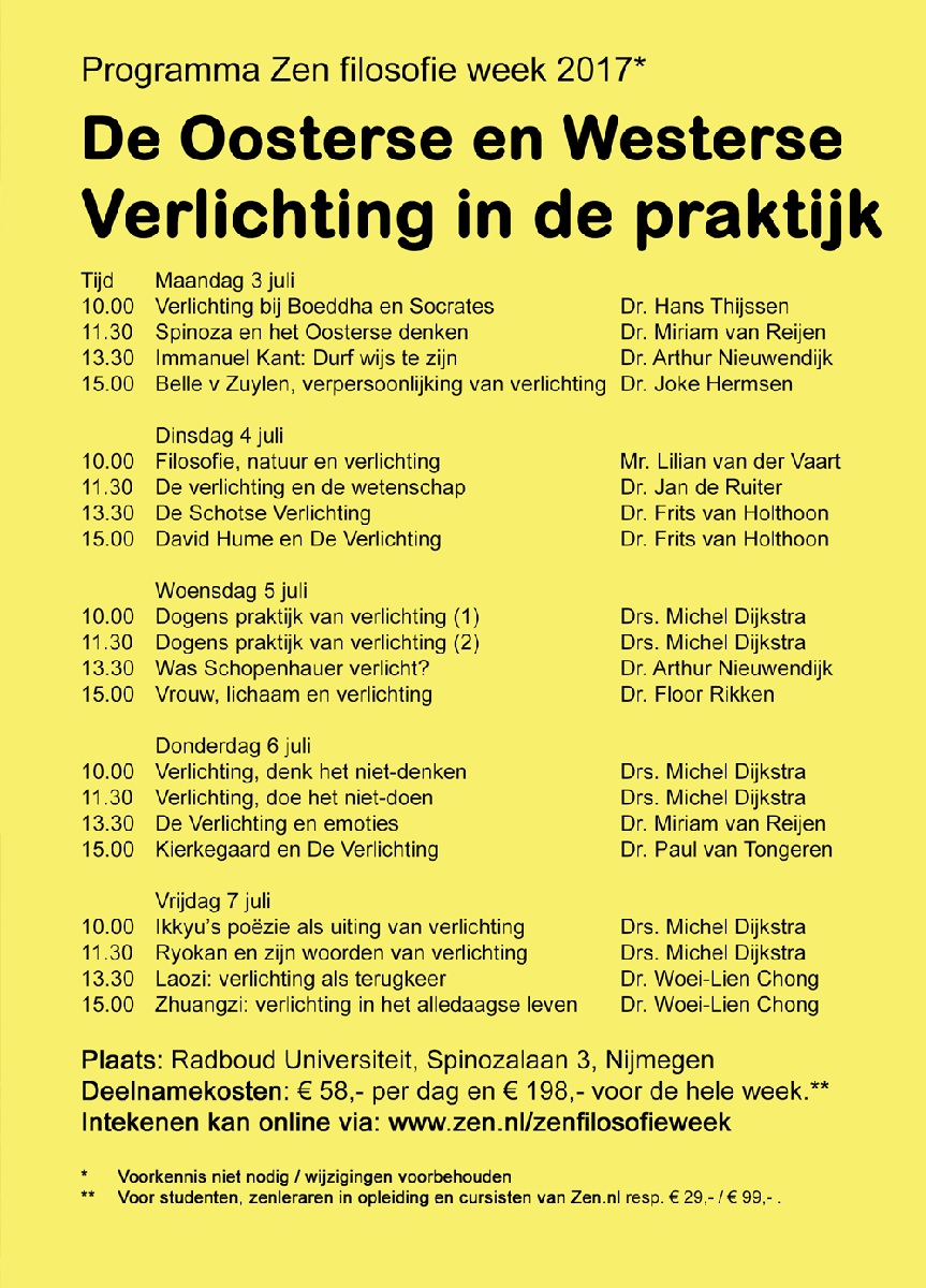 Zen filosofieweek van 3 t/m 7 juli 2017, die als thema heeft: De Oosterse en Westerse Verlichting in de praktijk zullen twaalf inleiders hun visie geven op dit onderwerp. Ieder voor zich zal een benadering kiezen vanuit een bepaalde visie of historische context. Niemand zal, denk ik, de pretentie hebben het hele onderwerp van Oost tot West tot in detail te kennen. Daarvoor is het teveelomvattend Maar juist omdat ik niet super gespecialiseerd ben en vooral vanuit een praktisch oogpunt naar alle opvattingen op dit gebied kijk, heb ik een rode draad ontdekt die indirect ook het thema voor deze week vormt. Deze rode draad begint bij de figuur van Boeddha. Volgens de overlevering was hij de eerste Verlichtingsfilosoof. Hij was op zoek naar de ultieme wijsheid en vond die niet in de bestaande theorieën.