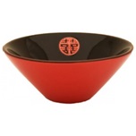 Zwart en rood vormen een traditionele Japanse kleurencombinatie, die geassocieerd wordt met kwaliteit en geluk. Dat komt mooi naar voren in deze rijstkom van Japans lakwerk, met het karakter van geluk erin.