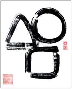 De drie symbolen worden in de zentraditie uit de losse hand gekalligrafeerd; dit symboliseert dat ieder moment uniek is en onderstreept ook het belang van spontaniteit. Zelf schilder ik deze symbolen al jaren, niet alleen traditioneel naast elkaar, maar ook in de variant op de afbeelding hieronder. Ook deze toont duidelijk de boodschap die deze symbolen hebben: de mens als verbindend element tussen hemel en aarde.