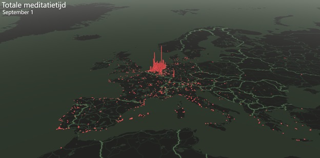 Sinds een jaar hebben we een nieuwe versie van de app, die meer mogelijkheden biedt om visueel te maken waar en wanneer er gemediteerd wordt. Om privacy redenen slaan we in deze nieuwe versie de locaties waar de timer gebruikt wordt met opzet een stuk minder nauwkeurig op. We hechten namelijk geen waarde aan de exacte locatie maar vinden het wel leuk om gebieden binnen Nederland met elkaar te vergelijken. Zie de ‘foto’ onderaan in dit artikel. Uit dit plaatje kun je waarschijnlijk ook opmaken waarheen mensen die de Zen.nl meditatie-timer gebruiken veel op vakantie gaan.