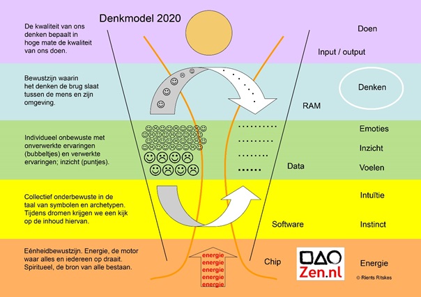 denkmodel. In dit model is aangegeven dat de taal van symbolen vooral ook de taal van het onderbewuste is. We herkennen symbolen vaak wel, maar zijn ons niet bewust van de werking ervan. De symbolische betekenis die iets heeft, kan heel persoonlijk zijn maar is vaak cultuurbepaald of zelfs universeel. In zen raken we door te mediteren en studeren meer bekend met de taal van symbolen en daarmee leren we er ook mee te communiceren. Het gaat om het beter doorzien van symbolische betekenissen waardoor je innerlijk nauwkeuriger kunt afstemmen op de wereld om je heen.