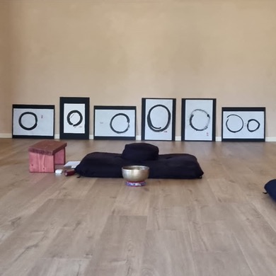 Het thema, “eenheid” was niet direct de reden dat ik me heb aangemeld. Jaren geleden werd ik geraakt door een Japanse cirkel-afbeelding (Enso) met daarin de woorden “ik ben thuis”. Dit was een goed moment om er zelf mee aan de slag te gaan en hopelijk een exemplaar mee naar huis te nemen dat het waard is om aan de muur te hangen. Verder had ik wel zin in een week creatief en zenvol bezig zijn in de geest van Lao Tze: “Wees stil als een berg en stroom als een geweldige rivier”.