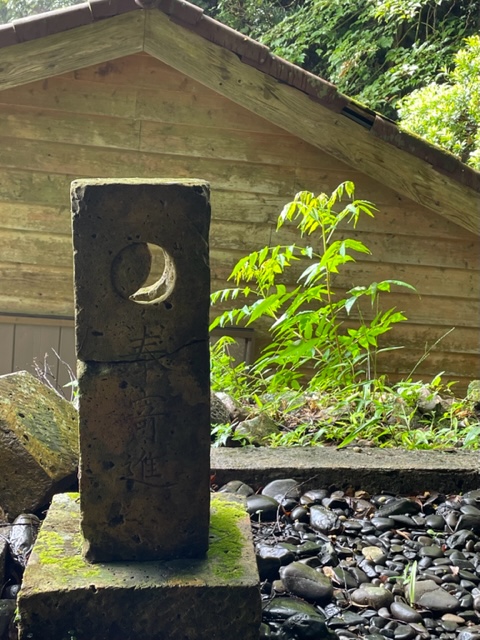 Nr. 89 - Foto gemaakt door Ad Vogelaar - Onoaida Onsen op het eiland Yakushima in Japan - markeringsteen vlakbij een oranje schrijn