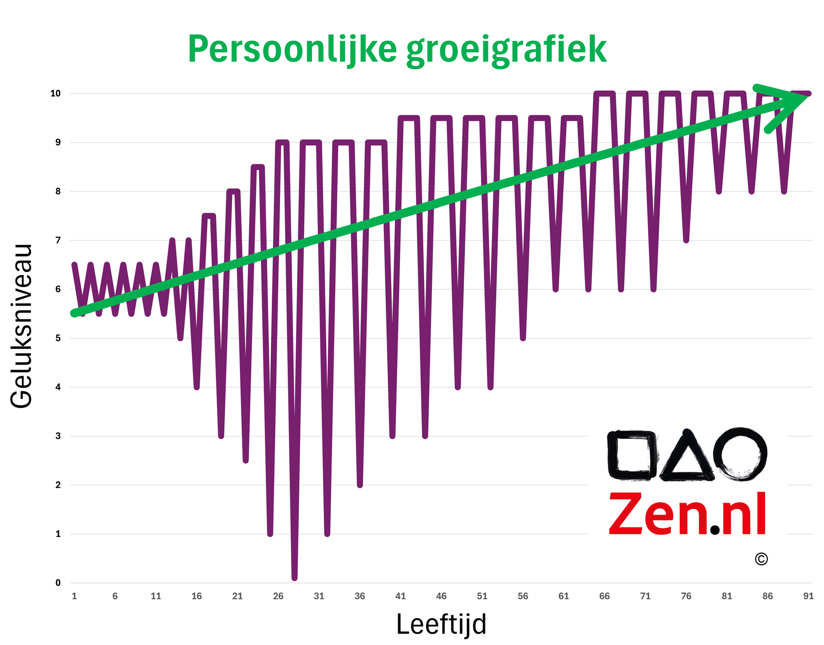 De persoonlijke groeigrafiek laat zien hoe de ideale persoonlijke ontwikkeling verloopt. De op- en neergaande lijn duidt op het regelmatig opzoeken en verleggen van de ondergrens. Dit is te vergelijken met het op peil brengen van je mentale conditie. Dit werken aan je conditie doe je door dagelijks een beetje af te zien, in de vorm van elke dag twee keer twintig minuten mediteren. Wekelijks train je in de zencursus om zo nu en dan nog eens wat langer stil te zitten en op stille zondagen mediteer je zelfs vier periodes van 25 minuten. Voor veel mensen is dit al een grote uitdaging en behoorlijk afzien, maar de rest van de dag voel je je dan heel tevreden en gelukkig. De groeigrafiek laat dus zien dat je die ondergrens dus regelmatig moet opzoeken om deze te kunnen verleggen. Regelmatig kort maar krachtig afzien is voldoende om er daarna steeds langer de vruchten van te plukken. Dat maakt dat de gemiddelde trendlijn langzaam maar zeker omhooggaat.